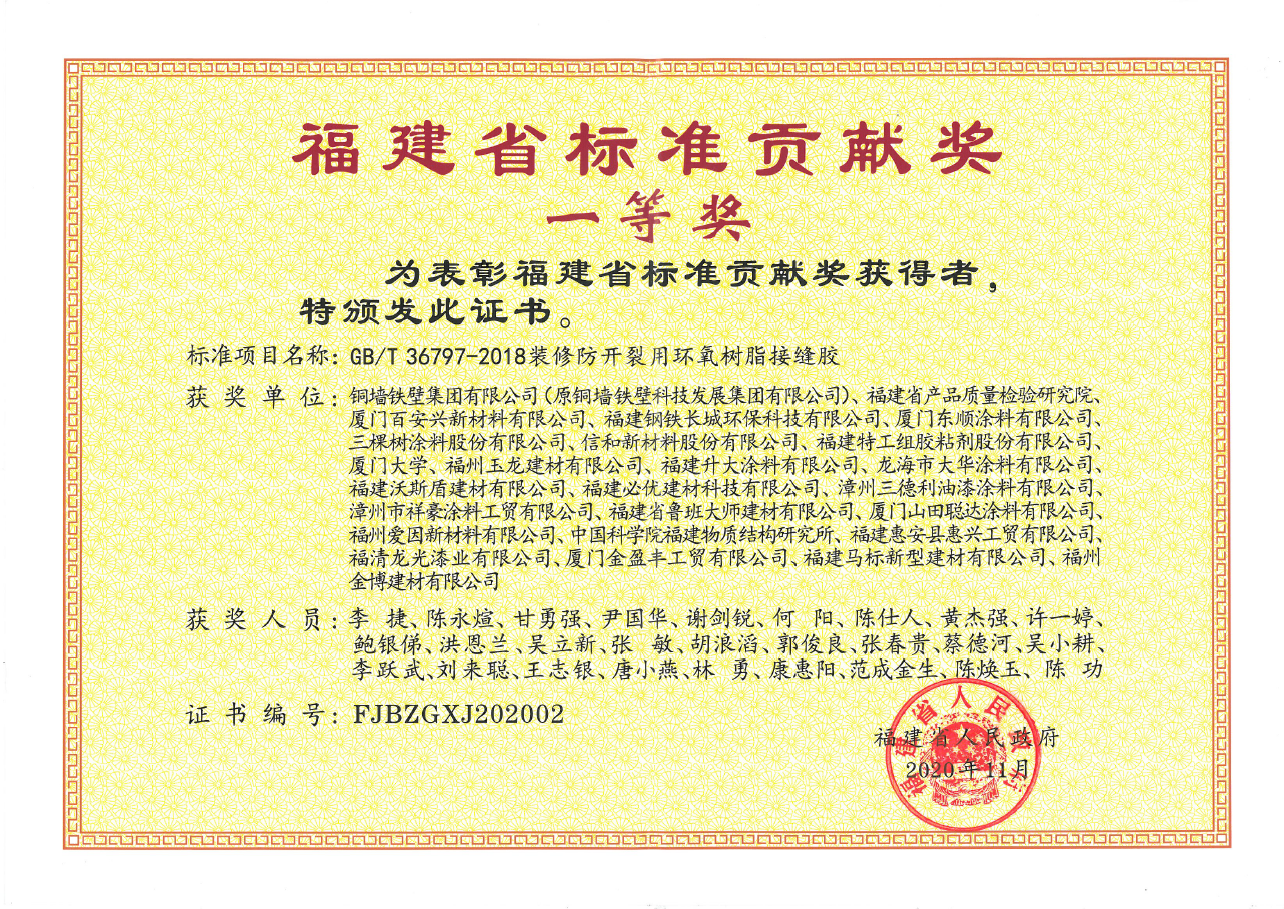 在本次國家標準的參編工作中,魯班大師企業充分發揮了十余年來膠粘相關產品研發與生產經驗的優勢,為標準的順利起草作出了巨大的貢獻。此次榮獲該獎項,是省委省政府與各級主管部門對魯班大師企業參與標準化工作的肯定,也是魯班大師企業多年來堅持自主研發、追求與行業頂端看齊的有力成果。