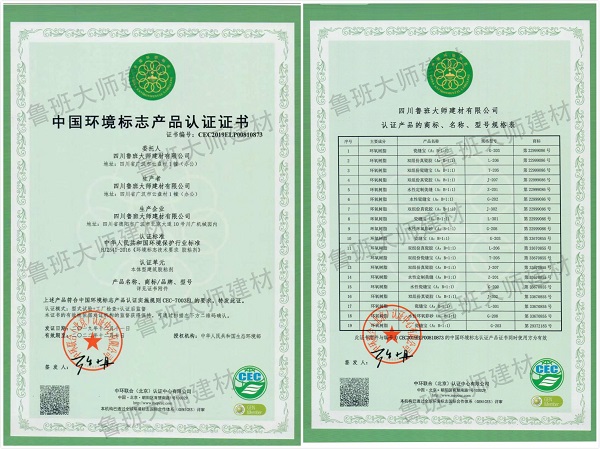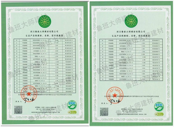 目前,魯班大師企業旗下四川魯班大師建材有限公司已通過國家權威環境標志認準(十環認證),是截止2019年12月11日為止,美縫行業“僅此一家”通過此環保機構認證的環保美縫生產企業。